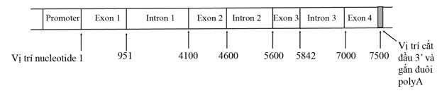 Theo đề bài, mRNA₁ gồm 4 exon nối tiếp. Từ hình ảnh, ta xác định được vị trí nucleotide của các exon như sau: