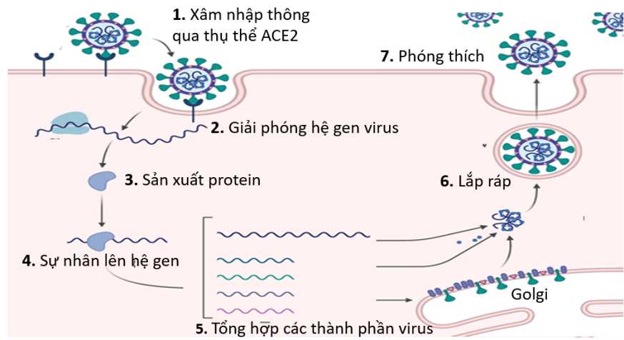 Quá trình nhân lên của virus SARS-COV-2 trong nhiều loại tế bào trong cơ thể người và động vật có vú khác, đặc biệt là tế bào biểu mô phổi được thể hiện trong hình dưới đây