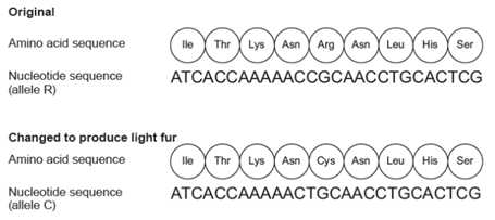 Biểu đồ dưới đây cho thấy một phần chuỗi aminoo acid của MC1R, một phần chuỗi nucleotide trong genee MC1R và cách nó có thể thay đổi để tạo ra lông màu sáng.