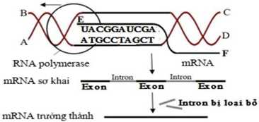 Quá trình phiên mã ở tế bào nhân thực, mRNA sau khi được tổng hợp sẽ được cắt bỏ intron và nối exon lại với nhau. (vùng mã hóa ở sinh vật nhân thực là vùng mã hóa phân mảnh) → mRNA trưởng thành mới tham gia dịch mã.