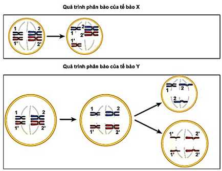 A Đúng. Tế bào X đang ở kì sau của giảm phân, trong đó 2 chiếc của NST số 2 đi về 1 phía, Tế bào Y giảm phân I bình thường, giảm phân II ở tế bào phía tên bị rối loạn, 2 chiếc của NST số 1 đi về 1 phía.✅