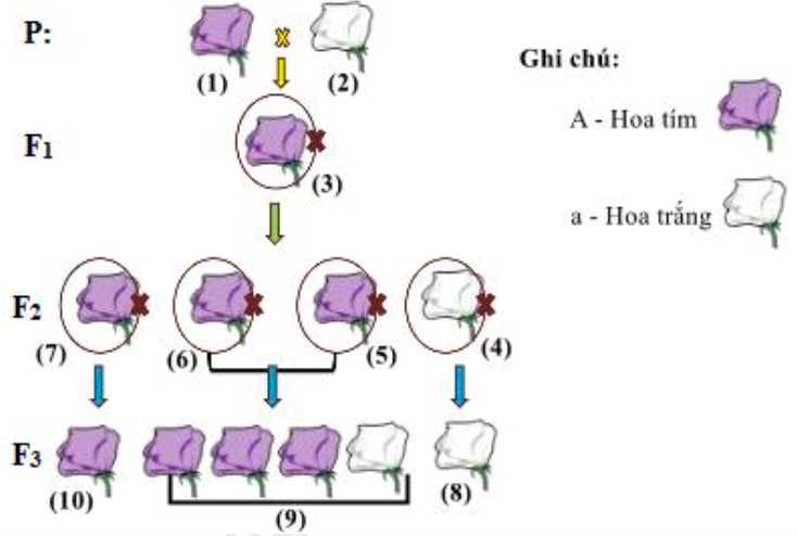 Hãy viết liền các số tương ứng với trình tự các bước Mendel đã tiến hành thí nghiệm lai để rút ra được quy luật di truyền.