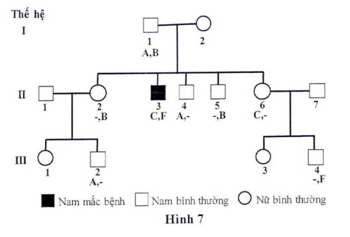 Hình trên cho thấy phả hệ về bệnh di truyền M ở người, bệnh này biểu hiện sau 40 tuổi. Gene gây bệnh liên kết hoàn toàn với hai locus. Locus thứ hai có hai gene B và F. Allele ở hai locus của người I1 và II3 đã được xác định. Dấu (-) thể hiện các allele chưa được xác định. Tất cả các cá thể ở thế hệ I và II đều trên 40 tuổi, trong khi bốn cá thể ở thế hệ III đều dưới 20 tuổi. Giả sử đột biến mới không xuất hiện và sự biểu hiện của gen không bị ảnh hưởng của các nhân tố khác.