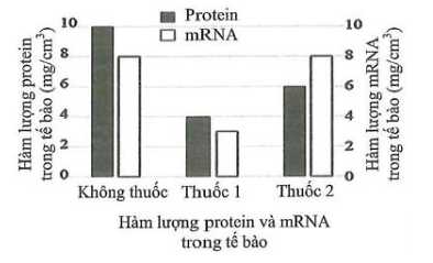 c đúng. Sử dụng thuốc 2 hàm lượng mRNA không đổi nhưng hàm lượng protein lại giảm so với khi không dùng thuốc chứng tỏ thuốc 2 ngăn cản quá trình dịch mã tạo protein hoặc phân giải protein.