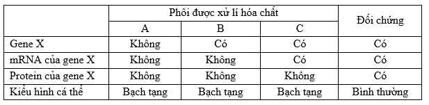 b) Đúng. Hoá chất C có thể đã ức chế quá trình dịch mã mRNA được tổng hợp từ gen X vì khi tế bào xử lí chất C thì protein không được tạo ra.
