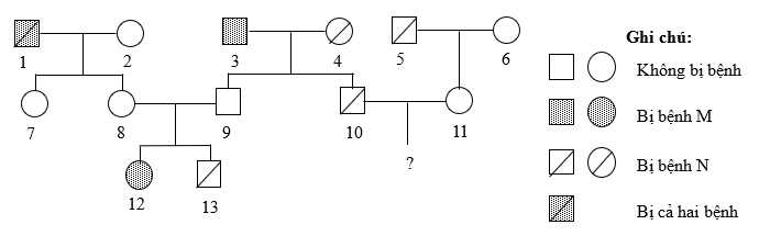Người nữ số 7 bị cả 2 bệnh nên có kiểu gene là XabXab. Người này sinh ra con gái số 13 không bị cả 2 bệnh nhưng nhận 1 NST X từ người mẹ 7 nên kiểu gene là XABXab.
