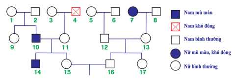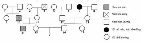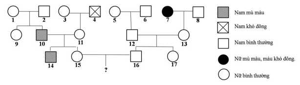 Người con gái số 11 có bố bị bệnh máu khó đông nên đã nhân được NST XAb từ bố. Người này lại có con trại 14 bị mù màu đã nhận NST XAb từ người số 13. Vậy người số 13 có kiểu gene là: XAbXaB.
