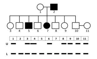 - Xét những người bị bệnh X: 2, 5 và 7 trong kiểu gen đều có alen L mà không có alen U → kiểu gen của họ là LL.