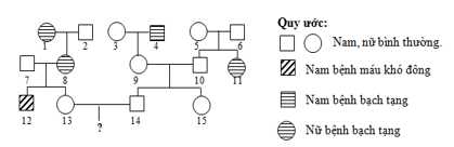 Biết rằng người phụ nữ số 3 mang gen gây bệnh máu khó đông, nếu người phụ nữ số 13 tiếp tục mang thai đứa con thứ 2 và bác sĩ cho biết thai nhi không bị bệnh bạch tạng, xác suất để thai nhi đó không bị bệnh máu khó đông là bao nhiêu?