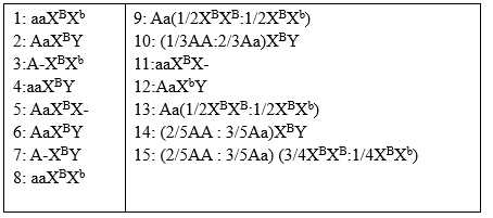 Vợ số 13:Aa(1/2XBXB:1/2XBXb) x Chồng số 14: (2/5AA:3/5Aa)XBY