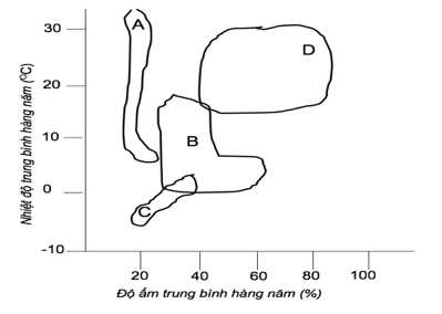 Câu 10 [869518]: Biểu đồ bên thể hiện ổ sinh thái nhiệt độ và độ ẩm của các loài A, B, C, D.
