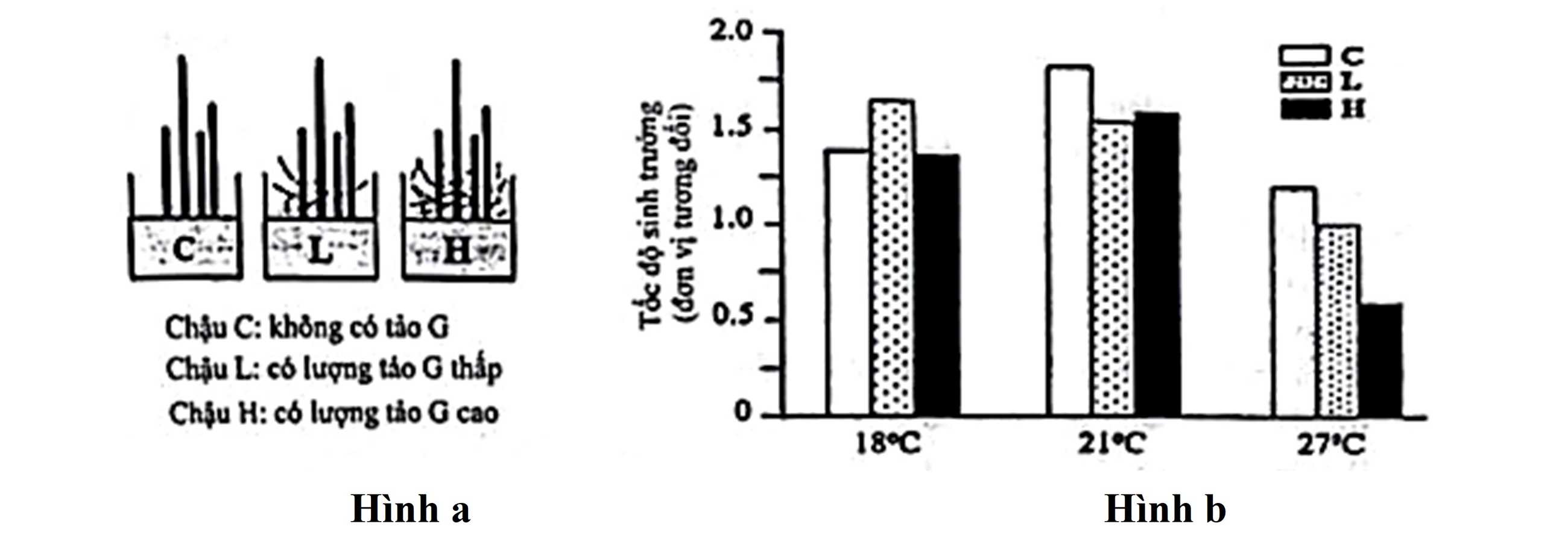 Câu 19 [869589]: Loài rong X sống ở vùng biển ven bờ Z, nơi có nhiệt độ mùa hè hiếm khi cao hơn 18°C. Thực hiện thí nghiệm nuôi loài rong X trong 3 chậu nuôi (hình a), ở 3 điều kiện nhiệt độ: 18°C, 21°C, 27°C, người ta thu được kết quả ở hình b.