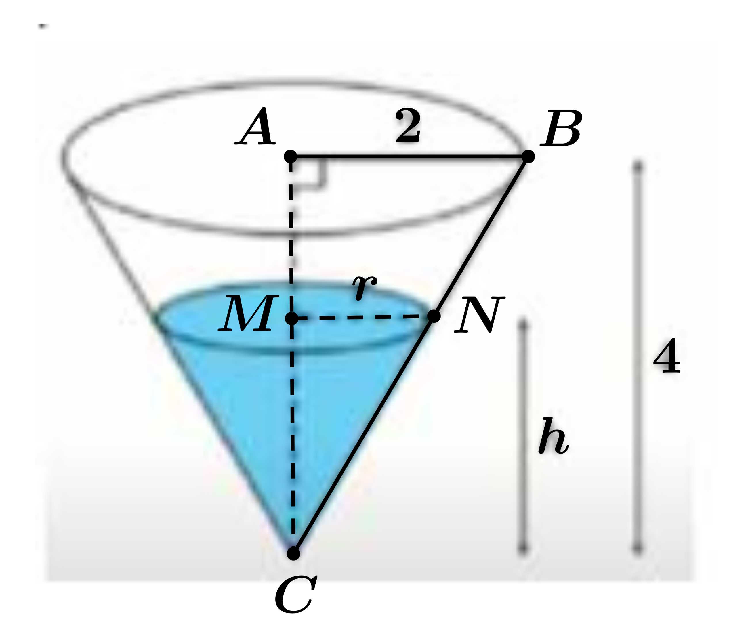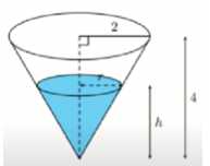 Câu 24 [1002630]: Một bể nước có dạng hình nón ngược với bán kính đáy bằng 2 m và chiều cao bằng 4 m (tham khảo hình vẽ). Nước được bơm vào bể với tốc độ không đổi là