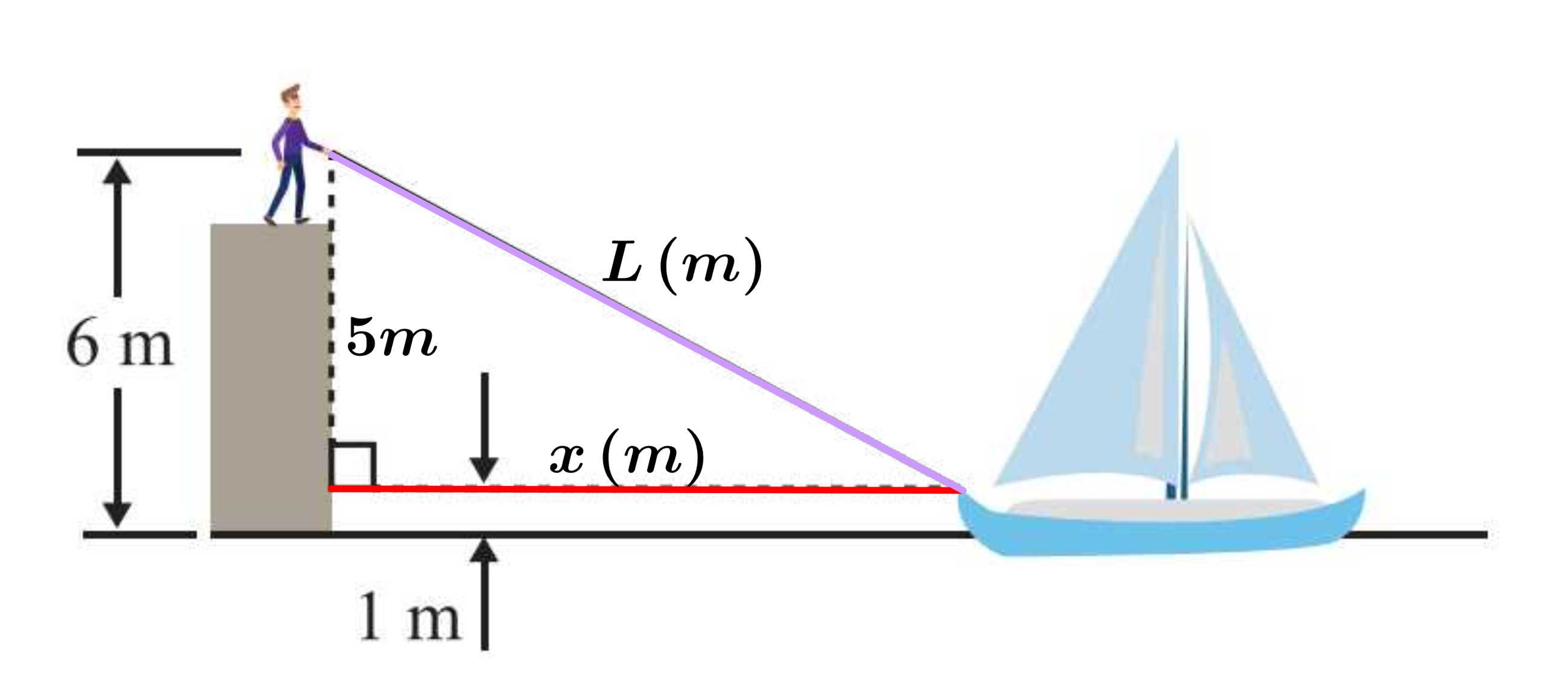 Câu 25 [1002631]: Một người trên cầu tàu kéo một chiếc thuyền về phía mình bằng cách kéo một sợi dây với tốc độ không đổi là 20 mét một phút. Sợi dây được gắn vào thuyền cách mặt nước 1 m và tay của người đàn ông cách mặt nước 6 m. Thuyền đang tiến đến cầu tàu với tốc độ bao nhiêu mét/phút tại thời điểm cách cầu tàu 15 m? (kết quả làm tròn đến hàng phần chục)?