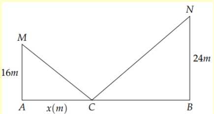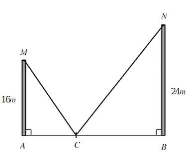 Câu 4 [861535]: Có hai cây cột, một cây cao 16 m và một cây cao 24 m đứng cách nhau 30 m. Chúng được giữ bằng hai sợi dây, gắn vào một cọc duy nhất nối từ mặt đất đến đỉnh mỗi cột (tham khảo hình vẽ sau).