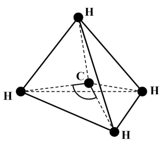 được cấu tạo bởi bốn nguyên tử hydrogen ở các đỉnh của một tứ diện đều và một nguyên tử carbon ở trọng tâm của tứ diện. Góc liên kết là góc tạo bởi liên kết