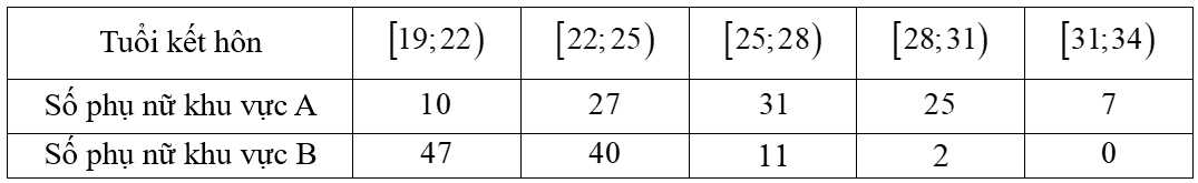 Câu 14 [373217]: Giả sử kết quả khảo sát hai khu vực A và B về độ tuổi kết hôn của một số phụ nữ vừa lập gia đình được cho ở bảng sau:
