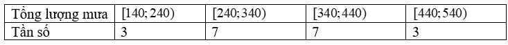 Lập bảng số liệu ghép nhóm về lượng mưa của thành phố A, với độ dài các nhómlà 50 và đầu mút phải của nhóm cuối cùng là 350. Xác định khoảng tứ phân vị của mẫu số liệu ghép nhóm đó (làm tròn kết quả đến hàng đơn vị). Đáp số:……………….