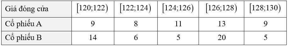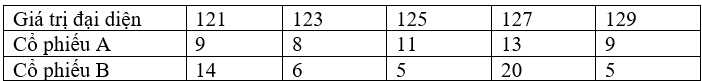 Câu 19 [879704]: Giá đóng cửa của một cổ phiếu là giá của cổ phiếu đó cuối một phiên giao dịch. Bảng sau thống kê giá đóng của (đơn vị là nghìn đồng) của hai mã cổ phiếu A và B trong 50 ngày giao dịch liên tiếp.