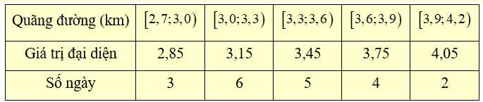 Câu 4 [392800]: [Trích SGK Chân Trời Sáng Tạo]: Mỗi ngày bác Hương đều đi bộ để rèn luyện sức khoẻ. Quãng đường đi bộ mỗi ngày (đơn vị: km) của bác Hương trong 20 ngày được thống kê lại ở bảng sau: