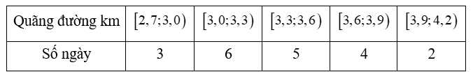 Câu 6 [861848]: Mỗi ngày bác Hương đều đi bộ để rèn luyện sức khỏe. Quãng đường đi bộ mỗi ngày (đơn vị: km) của bác Hương trong 20 ngày được thống kê lại ở bảng sau: