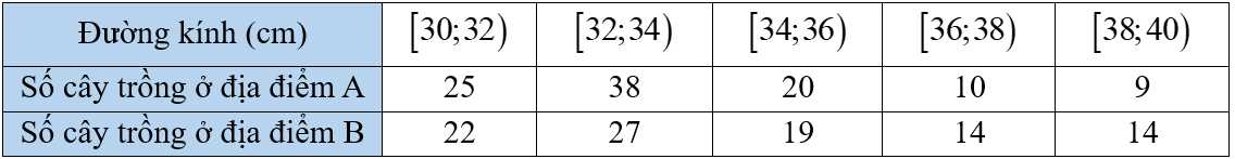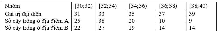 Câu 14 [879702]: Một giống cây xoan đào được trồng tại hai địa điểm A và B. Người ta thống kê đường kính thân của một số cây xoan đào 5 năm tuổi ở bảng sau