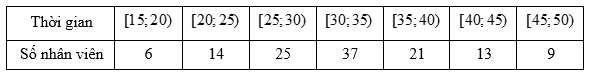 Câu 1 [547574]: Cho mẫu số liệu ghép nhóm về thời gian (phút) đi từ nhà đến nơi làm việc của các nhân viên một công ty như sau: