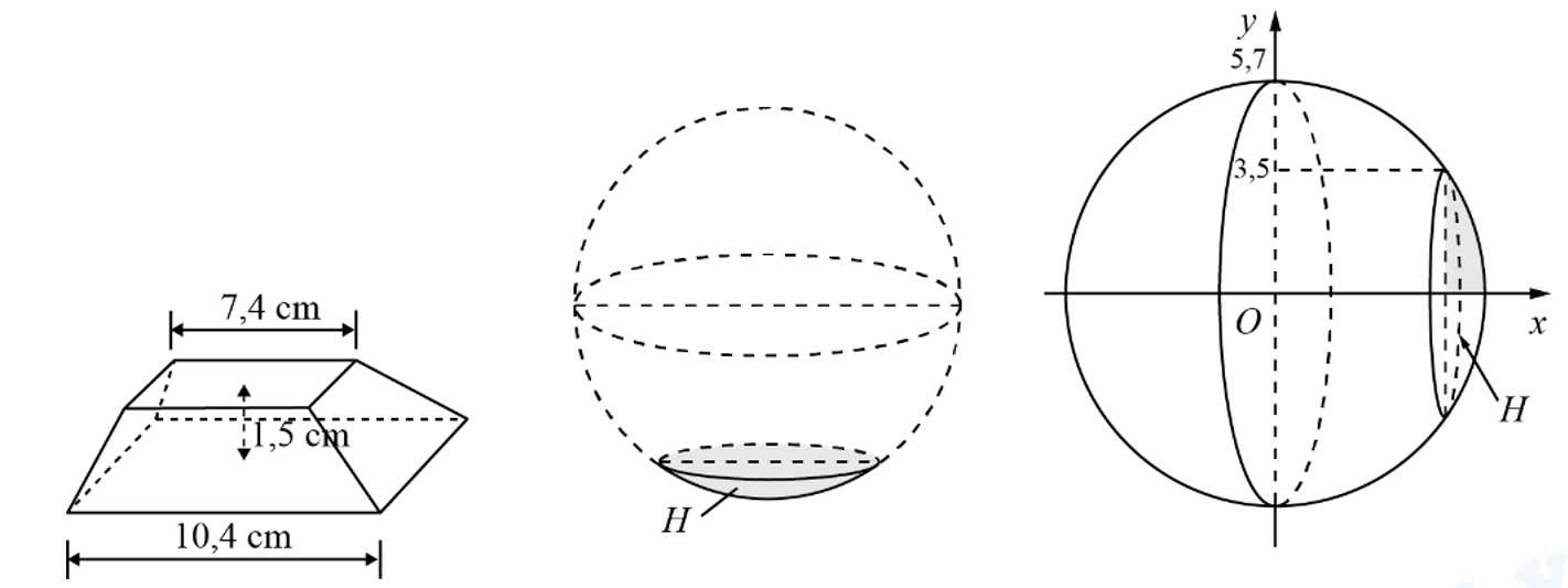 Câu 11 [1023981]: Để đặt được một vật trang trí trên mặt bàn, người ta thiết kế một chân để như sau. Lấy một khối gỗ có dạng khối chóp cụt tứ giác đều với độ dài hai cạnh đáy lần lượt bằng 7,4 cm và 10,4 cm, bề dày của khối gỗ bằng 1,5 cm. Sau đó khoét bỏ đi một phần của khối gỗ sao cho phần đó có dạng vật thể H, ở đó H nhận được bằng cách cắt khối cầu bán kính 5,7 cm bởi một mặt phẳng cắt mà mặt cắt là hình tròn bán kính 3,5 cm (xem hình dưới).