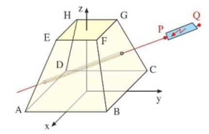 Câu 24 [1001312]: Một khối thép không rỉ có dạng một hình chóp cụt đều có đáy là hình vuông. Độ dài cạnh của đáy lớn là 8 cm, độ dài cạnh đáy nhỏ là 4 cm và chiều cao của khối là 8 cm. Một tia laser được chiếu theo đường thẳng