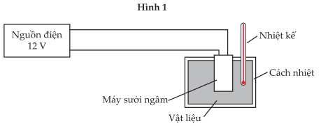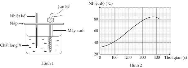 Hình 1 trên đây cho thấy một bộ thí nghiệm để tìm nhiệt dung riêng của một chất lỏng. Chất lỏng X, được chứa trong một cốc nhựa, được đun nóng từ nhiệt độ phòng bằng một dây nung nhúng chìm. Năng lượng truyền qua dây nung được đo bằng Jun kế. Dây nung được bật trong 330 giây rồi tắt đi. Sự biến thiên nhiệt độ của chất lỏng X theo thời gian được vẽ trên đồ thị ở hình 2.