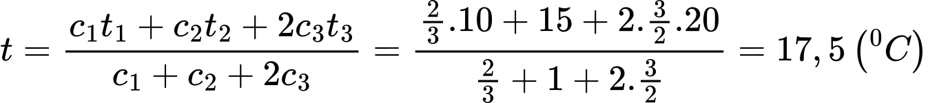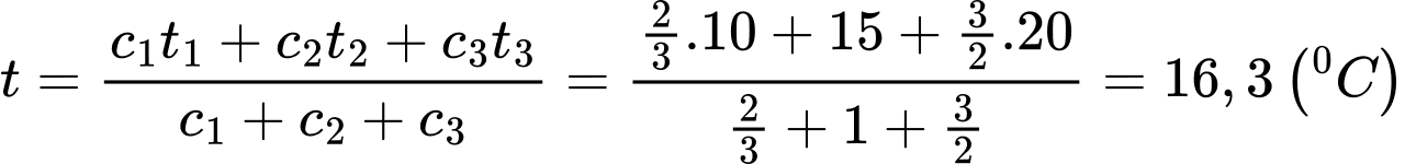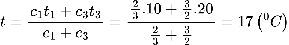 Câu 1 [580102]: Ba bình 1, 2, 3 đựng chất lỏng khác nhau có nhiệt độ là t1 = 30°C, t2 = 10°C, t3 = 45°C. Nếu đổ một nửa chất lỏng ở bình 1 sang bình 2 thì nhiệt độ của hỗn hợp khi cân bằng là t12 = 15°C, nếu đổ một nửa chất lỏng ở bình 1 sang bình 3 thì nhiệt độ của hỗn hợp khi cân bằng là t13 = 35°C. Bỏ qua sự trao đổi nhiệt của nước với bình và môi trường và khi đổ các chất lỏng vào nhau không xảy ra phản ứng hóa học. Nếu đổ chất lỏng ở 3 bình vào chung một bình thì nhiệt độ của hỗn hợp khi cân bằng là