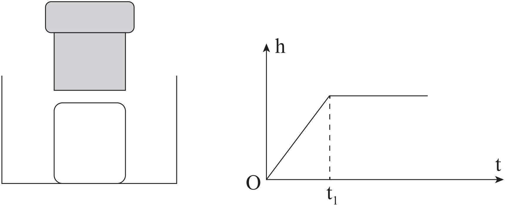 Câu 26 [1013195]: Đặt một viên nước đá đặc có khối lượng 100 g hình trụ có diện tích đáy là S1, ở nhiệt độ 0 °C vào trong một cái cốc hình trụ có tiết diện đáy là S2 = 4S1 như hình vẽ. Chiếu một đèn laze lên viên nước đá đảm bảo đèn chỉ chiếu vào mặt trên của nó để nước đá chỉ tan ở phần có laze chiếu vào. Quan sát mực nước trong cốc theo thời gian và vẽ đồ thị như hình bên. Bỏ qua sự trao đổi nhiệt của môi trường lên nước đá và nước trong cốc và sự thay đổi thế năng trọng trường của hệ. Biết nhiệt nóng chảy riêng của nước đá là 3,34.105 J/kg. Nhiệt lượng mà chùm laze cung cấp cho viên nước đá kể từ khi chiếu đến thời điểm t1 là bao nhiêu kJ (kết quả làm tròn đến chữ số hàng phần mười)