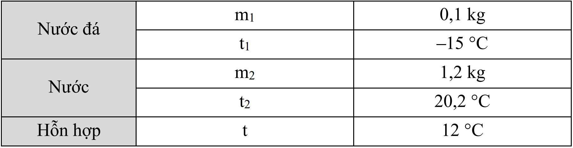 Câu 28 [1027062]: Một học sinh thực hiện một thí nghiệm để tìm nhiệt nóng chảy riêng của nước đá bằng phương pháp pha trộn. Em đó đặt 0,02 kg nước đá ở 0 °C vào một cốc nhựa (có nhiệt dung không đáng kể và cách nhiệt tốt) chứa 0,05 kg nước ở 20 °C. Cho nhiệt dung riêng của nước = 4200 (J /kg.K), nhiệt nóng chảy riêng của nước đá = 336000 J/kg.