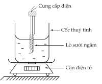 Câu 29 [1027063]: Một học sinh thực hiện một thí nghiệm để tìm nhiệt hóa hơi riêng của nước. Một cốc chứa nước được đặt trên một cân điện tử. Nước được đun nóng bằng một dây đun nhúng công suất 100 W, được nhúng trong nước sao cho nó không chạm vào cốc, như trong hình trên.
