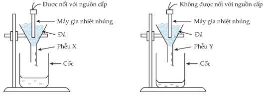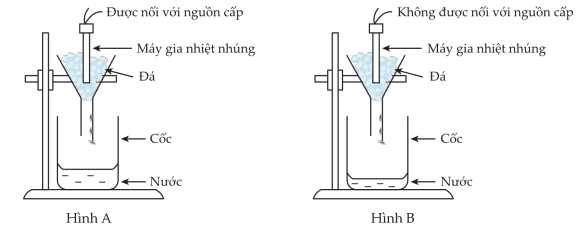 Câu 28 [1028004]: Hình dưới đây cho thấy một thiết lập thí nghiệm để xác định nhiệt nóng chảy riêng của nước đá. Nước đá được sử dụng là nước đá vụn và đang tan chảy. Ở phía bên trái (hình A), năng lượng điện tiêu thụ bởi dây đun được đo bằng một jun kế (joulemeter). Nước từ nước đá tan chảy được thu vào một cốc. Ở phía bên phải (hình B), là một thí nghiệm đối chứng của A được thiết lập mà không có nguồn điện cung cấp cho dây đun.