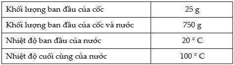 Một học sinh sử dụng máy gia nhiệt có công suất 2,0 kW nhúng vào cốc cách nhiệt. Máy gia nhiệt được bật và sau 120 giây, nước đạt đến điểm sôi. Dữ liệu thu thập được trong quá trình thí nghiệm được đưa ra dưới đây.