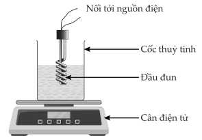 Bước 5: Khuấy liên tục để nước nóng đều. Cứ sau mỗi khoảng thời gian 1 phút đọc công suất dòng điện từ oát kế, nhiệt độ từ nhiệt kế rồi điền kết quả vào vở.