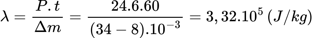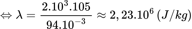b. Học sinh trong phần (a) tiếp tục đun nóng nước để nước sôi trong 105 giây. Khi đo lại khối lượng của cốc và nước, người ta thấy rằng nó đã giảm 94 g. Tính toán giá trị cho nhiệt hóa hơi riêng của của nước ở nhiệt độ sôi.