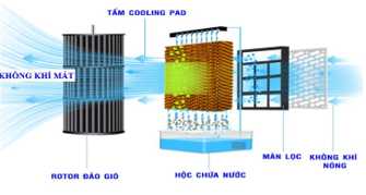 Câu 21 [1028868]: Quạt điều hòa hoạt động dựa trên nguyên lý bốc hơi tự nhiên của nước với các bước hoạt động chính như sau: Máy bơm nước dẫn từ khay nước lên tấm làm mát Cooling Pad được thiết kế dạng lưới tổ ong, làm tăng diện tích bề mặt tiếp xúc với không khí, không khí nóng được hút từ bên ngoài vào đi qua tấm làm mát, nước ở bề mặt tấm làm mát sẽ hấp thụ nhiệt của luồng khí nóng để bay hơi tự nhiên, khiến nhiệt độ không khí được giảm xuống và hình thành luồng không khí mát. Xét một quạt điều hòa đang hoạt động ổn định: lưu lượng gió 50 lít/giây, nhiệt độ không khí hút vào là 36 °C, nhiệt độ không khí thổi ra là 31 °C, nhiệt hóa hơi riêng của nước là