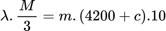 Câu 28 [1028875]: Một chiếc cốc hình trụ khối lượng m trong đó chứa một lượng nước cũng có khối lượng m đang ở nhiệt độ t1 = 10 °C. Người ta thả vào cốc một cục nước đá có khối lượng M đang ở nhiệt độ 0 °C thì cục nước đá chỉ tan 1/3 khối lượng của nó và luôn nổi trong khi tan. Rót thêm một lượng nước ở nhiệt độ t2 = 40 °C vào cốc, khi cân bằng nhiệt thì nhiệt độ của cốc nước là 10 °C còn mực nước trong cốc có chiều cao gấp đôi chiều cao mực nước sau khi thả cục nước đá (có cân bằng nhiệt). Bỏ qua sự trao đổi nhiệt với môi trường xung quanh, sự dãn nở của nước và cốc. Biết nhiệt dung riêng của nước là c = 4200 J/(kg.K), nhiệt nóng chảy của nước đá là 3,36.105 J/kg. Nhiệt dung riêng của chất làm cốc có giá trị là bao nhiêu? (kết quả làm tròn đến chữ số hàng đơn vị)