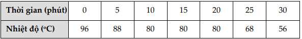 Một chất rắn kết tinh bị nấu chảy thành chất lỏng nóng và sau đó nguội đi. Bảng bên dưới ghi lại nhiệt độ của mẫu chất lỏng nóng theo thời gian.