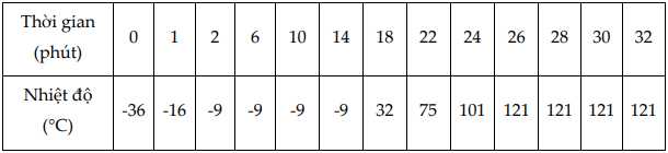 Một chất A đang ở trạng thái rắn ở nhiệt độ –36 °C. Nó được đun nóng với tốc độ không đổi trong 32 phút. Ghi chép về nhiệt độ của nó được đưa ra trong bảng dưới đây