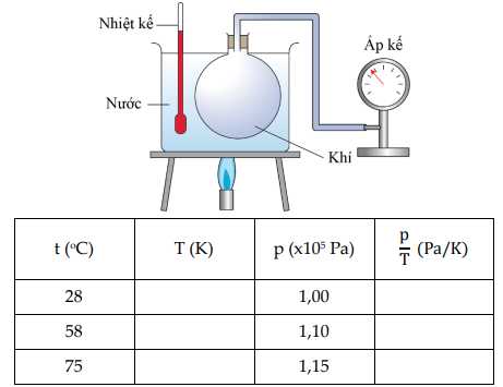 Câu 56 [1028882]: Một học sinh tiến hành thí nghiệm khảo sát sự phụ thuộc của áp suất p theo nhiệt độ tuyệt đối T theo sơ đồ như hình bên. Trong đó, bình thủy tinh hình cầu có nút kín, trong có chứa khí được nối thông với áp kế qua một ống nhỏ. Bình thủy tinh được nhúng trong một bình nước, nhiệt độ của nước được đo bởi một nhiệt kế. Đun nóng từ từ nước trong bình rồi ghi lại giá trị nhiệt độ t được chỉ bởi nhiệt kế và áp suất p được chỉ bởi áp kế thu được kết quả ở bảng sau: