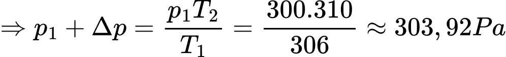Câu 50 [682056]: Một bình được nạp khí ở 33°C dưới áp suất 300 Pa. Sau đó bình được chuyển đến một nơi có nhiệt độ 37°C, coi thể tích của bình không thay đổi. Áp suất của khí trong bình tăng bao nhiêu Pa (kết quả làm tròn đến chữ số hàng phần trăm)?