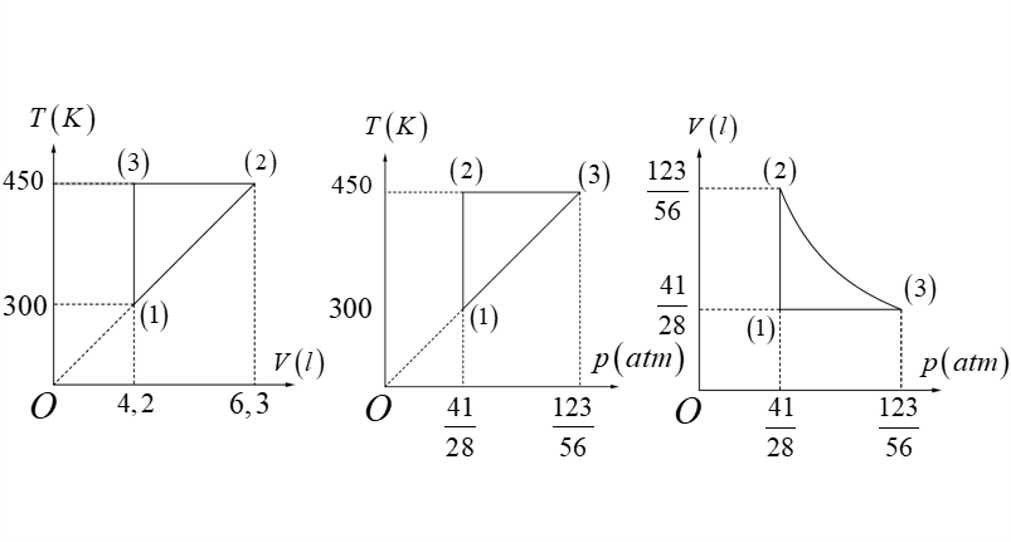 Quá trình biến đổi từ trạng thái (1) sang (2) ta thấy đường biểu diễn là đường tuyến tính đi qua gốc tọa độ nên đây là quá trình đẳng tích. Quá trình biến đổi từ trạng thái (2) sang (3) ta thấy đường biểu diễn là đường vuông góc với trục OT,