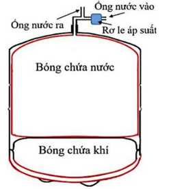 Câu 22 [1029242]: Một bình tích áp được dùng trong máy lọc nước có hai phần: bóng chứa nước và bóng chứa khí như hình bên. Khi chưa chứa nước, bóng chứa khí chiếm toàn bộ thể tích trong bình là 12 lít, áp suất 120 kPa. Đường ống dẫn nước vào, ra bóng chứa nước có gắn rơ le áp suất điều khiển đóng mở mạch điện. Khi lượng nước trong bóng chứa nước tăng đến 9 lít thì áp suất nước đạt cực đại, rơ le ngắt mạch, máy ngừng cung cấp nước vào bình. Khi lượng nước trong bình giảm đến 6 lít, rơ le tự động đóng mạch để máy cung cấp nước trở lại. Coi nhiệt độ trong bóng chứa khí không đổi. Các bóng mềm, tổng thể tích nước và khí bằng thể tích bình, mặt tiếp xúc của bóng chứa nước và chứa khí luôn có dạng phẳng.