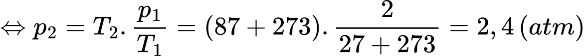 Câu 24 [1029244]: Một bình kín chứa khí lí tưởng ở nhiệt độ 27 °C và áp suất 2 atm. Nếu nung nóng đẳng tích khí tới nhiệt độ 87 °C thì áp suất của khí trong bình khi đó là bao nhiêu atm? (Kết quả làm tròn đến chữ số hàng phần mười).