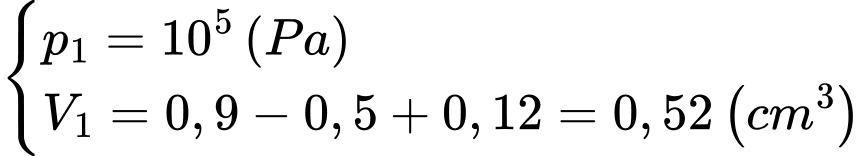Câu 3 [1029223]: Để thuận tiện cho việc rút thuốc từ lọ thuốc kín, y tá thường sử dụng ống tiêm để bơm một lượng nhỏ không khí vào lọ thuốc như hình bên. Xét một lọ thuốc có dung tích 0,9 ml và chứa 0,5 ml dung dịch thuốc, áp suất của phần không khí trong lọ là 105 Pa. Người y tá sử dụng ống tiêm để bơm từ từ một lượng không khí có thể tích 0,12 cm3 và áp suất ban đầu 105 Pa vào lọ thuốc. Biết nhiệt độ bên trong và bên ngoài lọ thuốc bằng nhau và không thay đổi. Áp suất của không khí trong lọ thuốc sau khi bơm hết là bao nhiêu? (coi không khí được đề cập trong bài là khí lý tưởng).