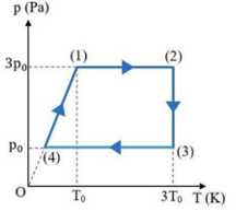 Câu 21 [1029264]: Một xi lanh đặt nằm ngang có pit-tông chuyển động được. Xi lanh chứa 2 g khí Helium (He), khối khí thực hiện chu trình biến đổi trạng thái từ (1) ⟶ (2) ⟶ (3) ⟶ (4) ⟶ (1) được biểu diễn trên đồ thị p - T như hình vẽ. Cho p0 = 1,5.105 Pa, T0 = 300K. Biết khối lượng mol của Helium là 4 g/mol; R = 8,31 J/(mol.K). Bỏ qua ma sát giữa xi lanh và pit-tông.