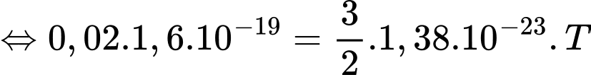 Câu 27 [1029270]: Một khối khí lí tưởng có động năng tịnh tiến trung bình của các phân tử khí bằng 0,02 eV. Cho hằng số Boltzmann k = 1,38.1023 J/K; 1eV = 1,6.10-19 J. Nhiệt độ của khối khí là bao nhiêu K (Làm tròn kết quả đến chữ số phần nguyên)?